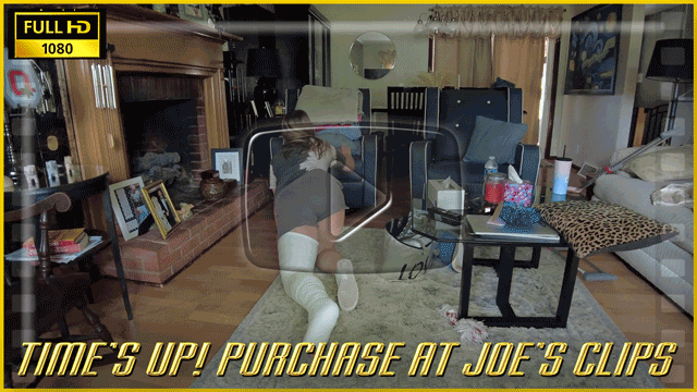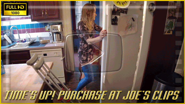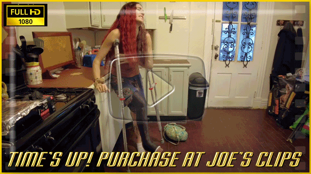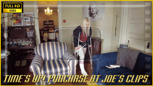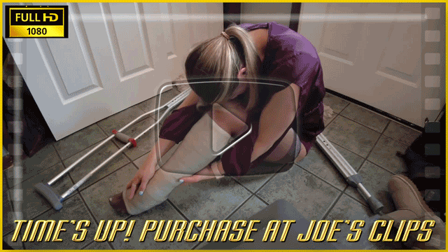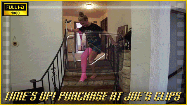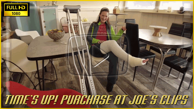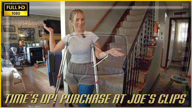 Ellen has discovered that she loves her cast and loves being casted. As her cast ages, she finds that she loves the smell of her blue SLC and casted toes. She starts off in bed in this clip, smelling her casted toes and not being able to resist rubbing one out before getting up. She crawls out of bed and scoots down the stairs. In the kitchen, she crutches around, getting herself a snack, when she hits her cast with the refrigerator door. This gives her the idea to be a little bit more rough on her cast, in hopes of getting to keep it longer. Cut to weeks later and her cast is noticeably older and dirty. She sits down and calls a friend, telling her about her cast and how she doesn't want to lose it yet. Once she's off the phone, she starts sniffing, licking and sucking her toes again as she masturbates with a vibrator. Finally, she tries jumping off the couch in an attempt to keep her cast longer.