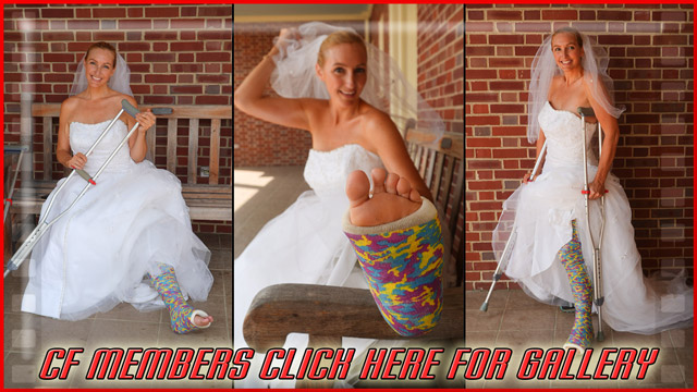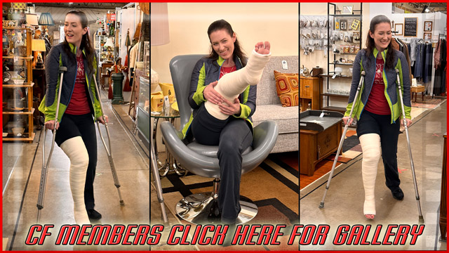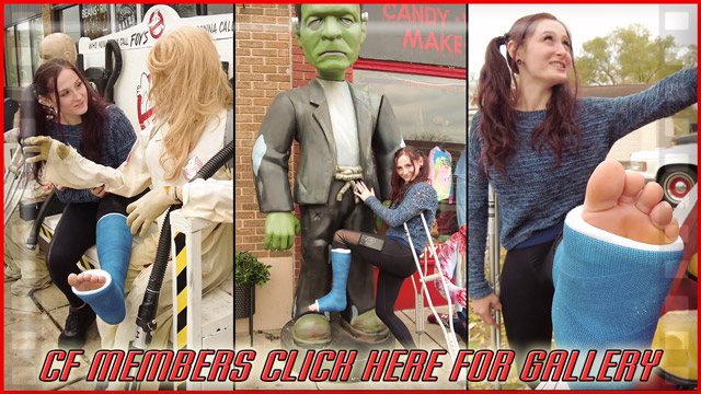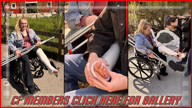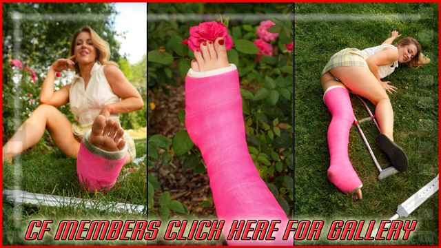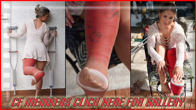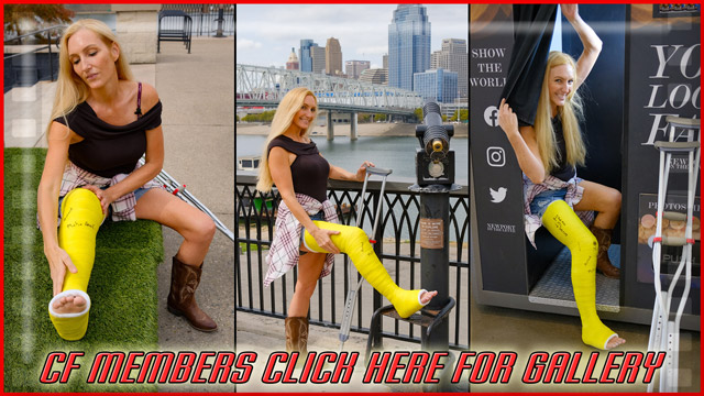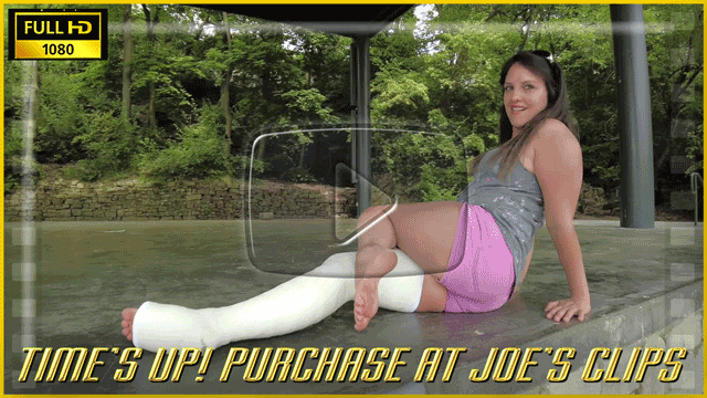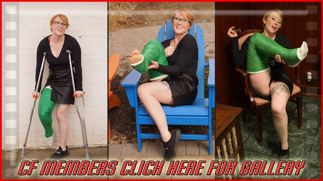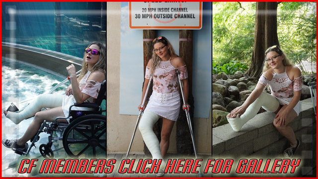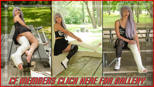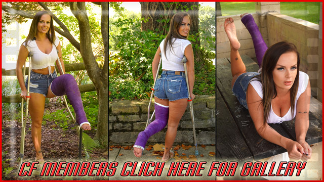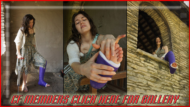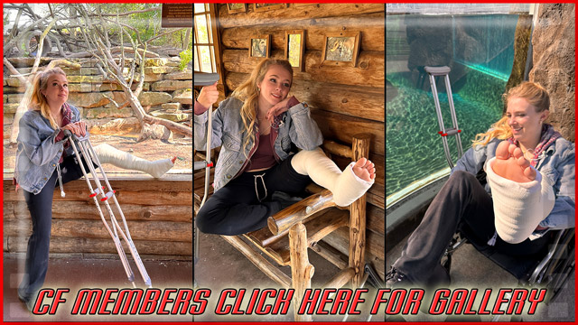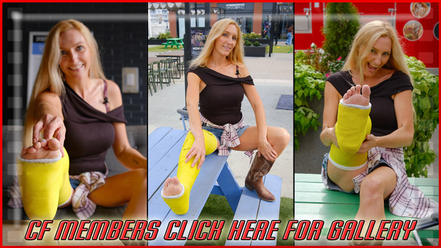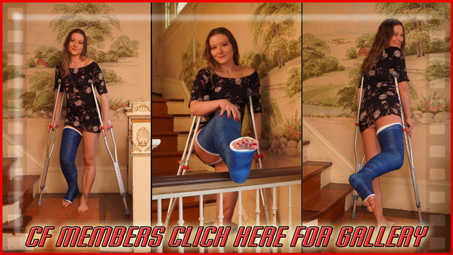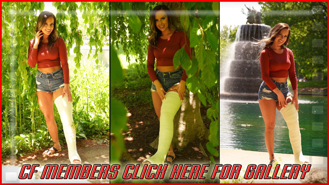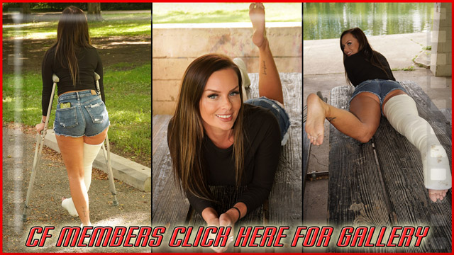 This shoot happed just a few hours ago TODAY (the 15th) and I was able to rush home and get it ready for an update. Jessie's a hot new model with great legs and feet that showed up in daisy dukes. The idea for the shoot just popped into my head. I asked her to pretend that she's just a regular model doing an outdoor shoot but she just so happens to have broken her leg about a week ago. She wants to keep working as a model even while she's casted and is grateful to anyone who is willing to work with her in her cast. She doesn't have any acting experience but she was perfect for this story and did an excellent job. She ad-libs and talks as she models in her LLC as best as she can. She's also new to crutches so she thanks the photographer for being patient with her, as well as being willing to shoot with her with her leg in a big cast. She crutches over to stairs for the first time and models up on the stage. She sits her crutches aside and hops into other positions. Sometimes she accidentally bumps her leg and yelps. After a few minutes, she says she needs to take a break to elevate her cast and wiggle her toes. She talks about her cast as she wiggles her cute casted toes and even brings her good foot into it. Oh, and she's got a cute southern accent. Let me know what you think of this model/theme.