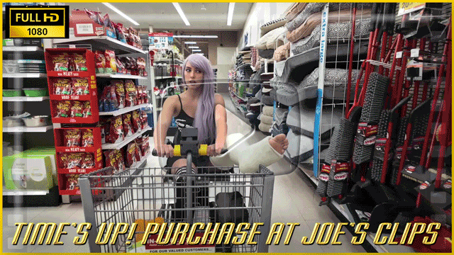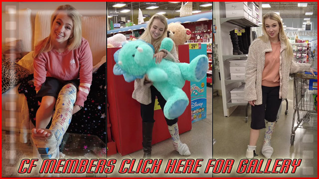 This is an idea I've had for a while now. What if I was on a shoot with a model when we found a woman in a real LLC and convinced her to join the shoot? That's exactly what happens in this clip. Lily and I are at Target with her in two blue arm casts, just browsing around, when she spots someone about her age in a pink LLC. She asks me if she thinks we should talk to her and I say yes. Angel says she's going to get close to her and see if she starts up the conversation. Lily gets close and starts splaying perfume, obviously trying to get her attention, but then the girl calls her by name. It turns out that it's someone that Lily went to college with named Audrey. Audrey says that she fell down some stairs and Lily tells her right away that she's doing a fetish shoot and points out the camera, which surprises Audrey. After checking with me, Lily asks her if she'd like to join our shoot and she agrees. Lily tells her that she just needs to crutch around and shop with her, so they head over to the shoe department. They shop around and Audrey takes a couple breaks to prop her legs up, but eventually she gets pretty tired and Lily goes to find her a cart to drive. All the electric scooters were dead so she comes back with a shopping cart with a seat built into it. Lily pushes her around in the cart as they continue to shop and it's a bit awkward and Lily accidentally bangs Audrey's leg into something.