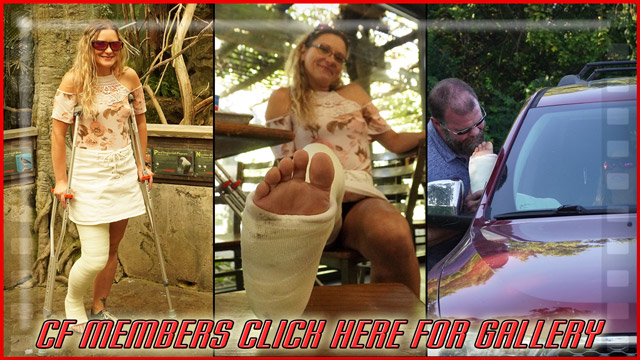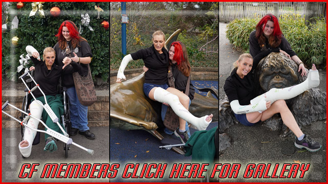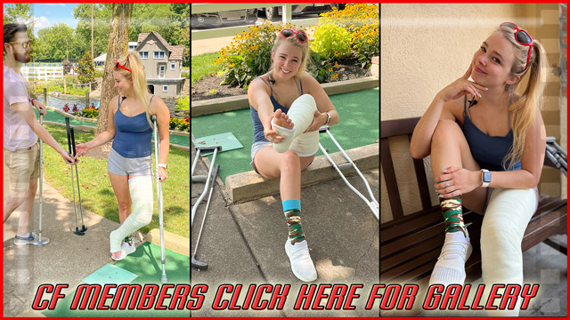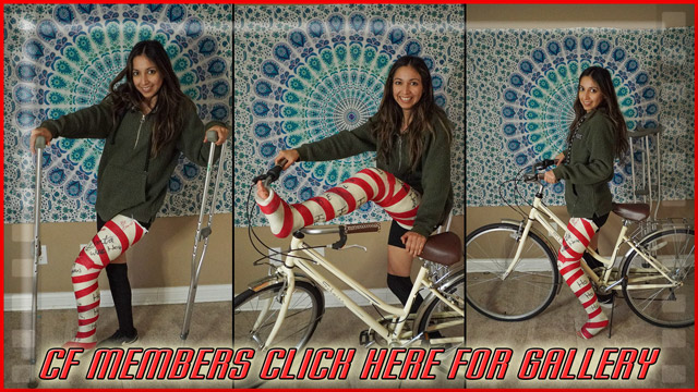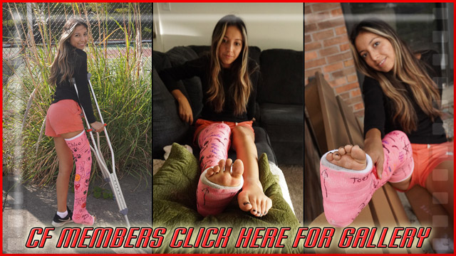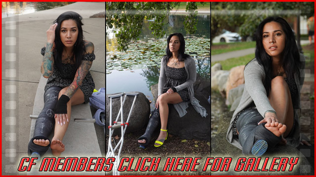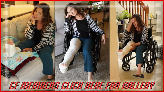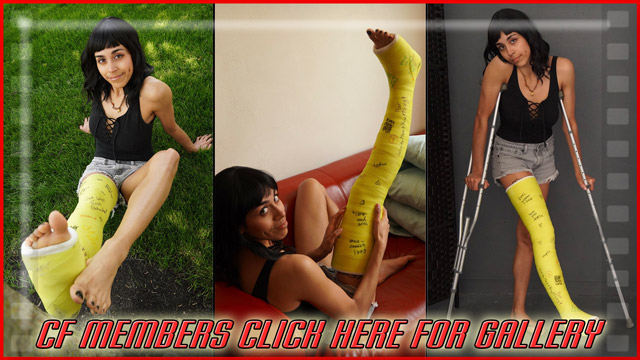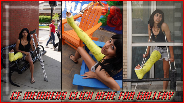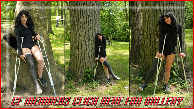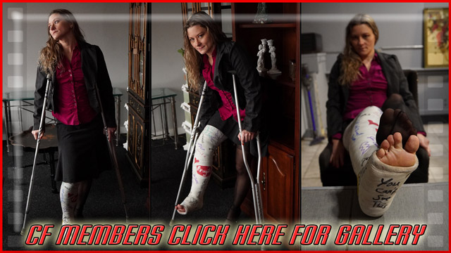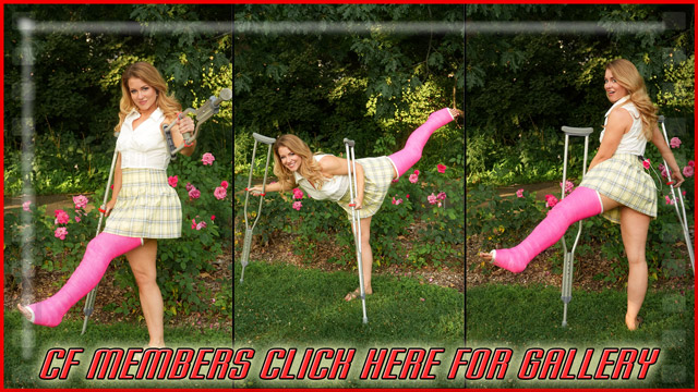 This gallery is a nice mix of outdoor posing on crutches, a few crutching shots and sitting down to take off her sock and have a sniff (her idea!) and a few indoors.