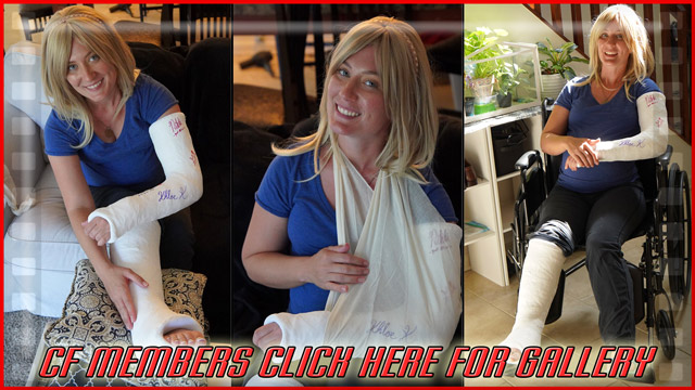 The beautiful Adina starts off strong in her first ever cast pictures on this site. In this gallery she props her cast up and touches her toes. I love her very expressive face.