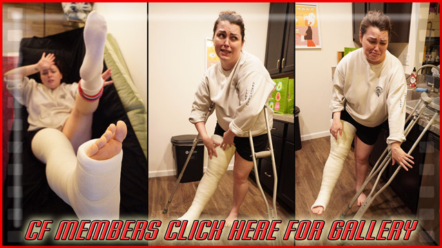 Victoria's excited to get back to the gym and since it's just around the corner, she's doing her stretches at home before she leaves. She goes through a couple of stretches, but when she's stretching the back of her leg, she hears a snap and the heel of her left foot is in extreme pain. She calls a friend to take her to the hospital. Next, she comes home in a pointed white SLC with an ankle sock over the toes. They didn't give her any painkillers, so she's in a great deal of pain and awkward on crutches. She makes her way to the kitchen and because she's not used to her cast, she bangs it a couple times, ending up with her on the floor moaning in pain. She makes her way to the living room where she slowly and painfully removes her sock and props her leg up on some pillows as she whines about her terrible situation. Next, it's another day and Victoria is going to attempt to get out of the house and see some friends. Still in a lot of pain, she carefully pulls pantyhose over her SLC and puts on a nice shoe. After touching up her hair in the mirror, she heads towards the front door when she slips on the rug and starts to fall. To be continued...